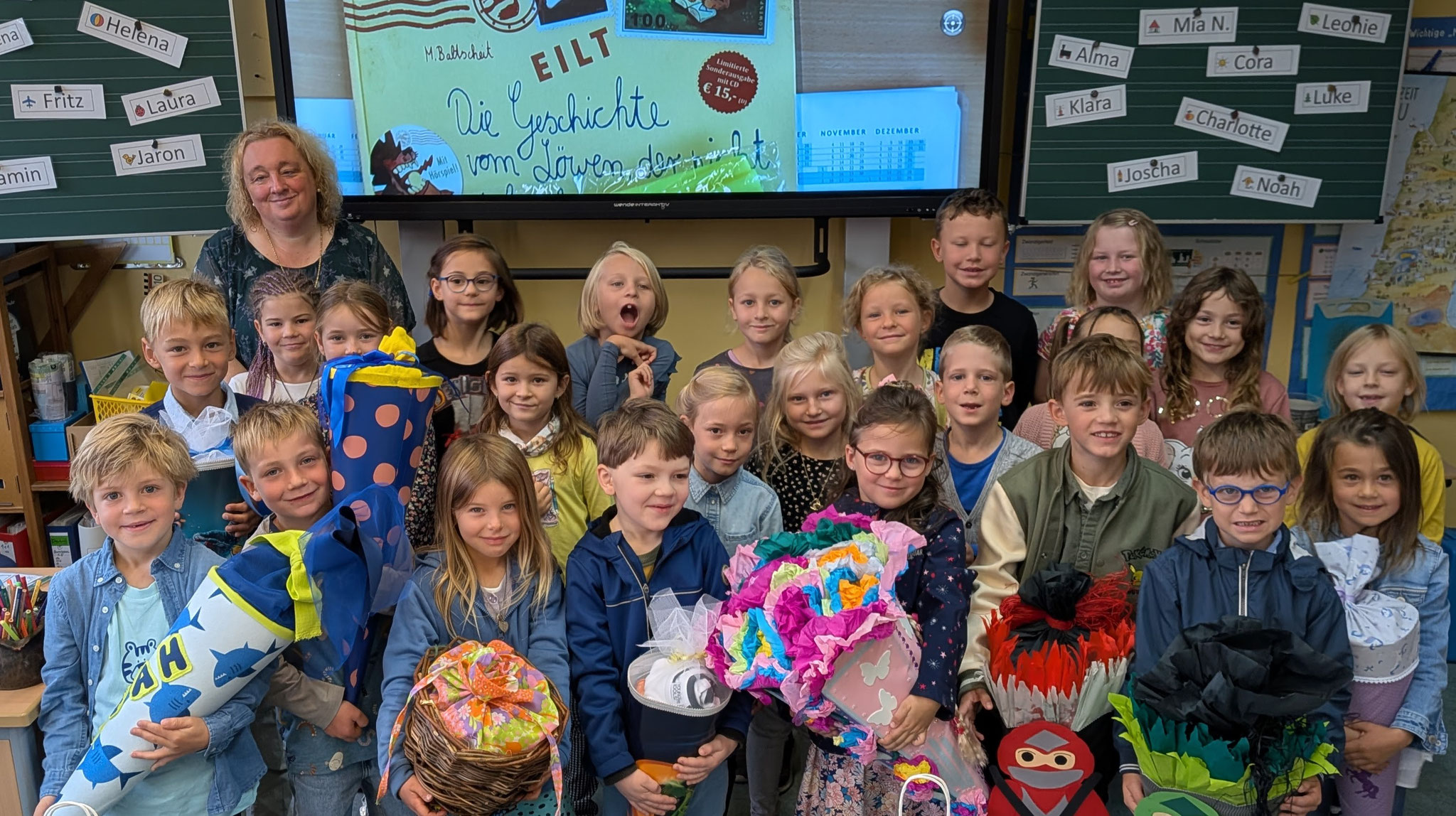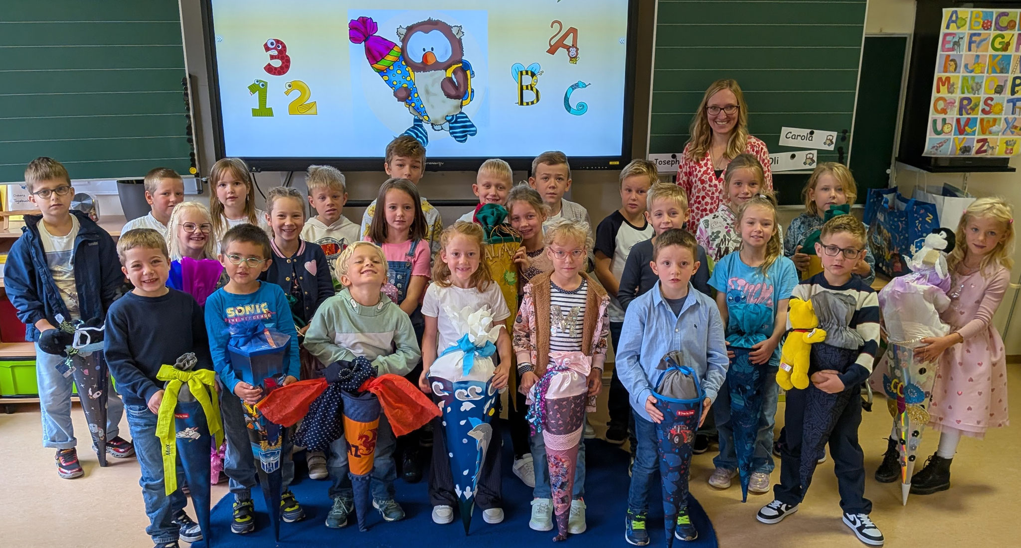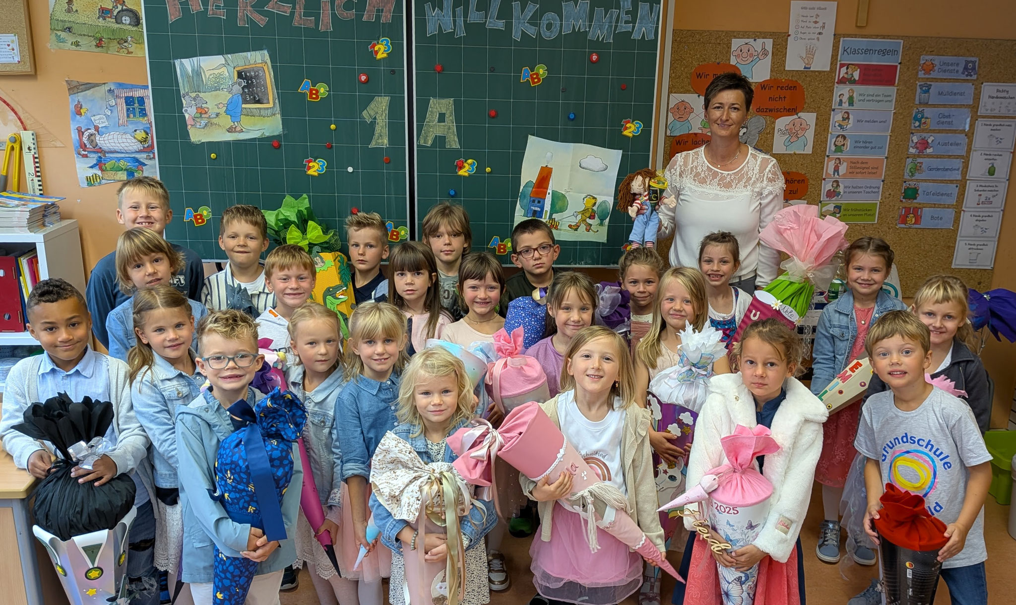 Die neuen Erstklässler der Klasse 1b feiern ihre Einschulung. Sie werden in den kommenden Jahren von Klassenleiterin Frau Martina Gießner-Schmidt begleitet.