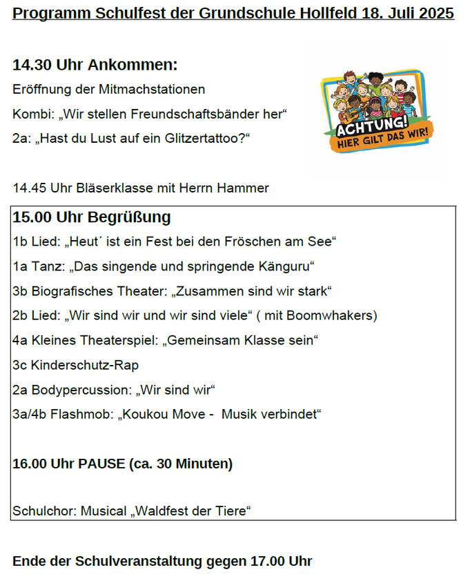 Die Vorplanungen zu unserer Projektwoche im Juli laufen! Im Mittelpunkt steht die gewaltfreie Kommunikation und damit besonders das WIR. WIR stärken uns für einen friedlichen Umgang miteinander. Ebenso Teil dieser Woche wird der Besuch des Leipziger Schul-Tournee-Theaters sein. Höhepunkt unserer Projektwoche ist das Schulfest am 18. Juli 2025.
